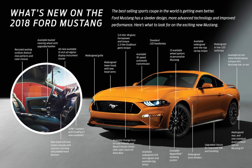 Como cabía esperar, el motor V6 de 3.7 litros de aspiración natural ha sido eliminado de la línea del Mustang 2018. El motor de entrada pasa a ser ahora un cuatro cilindros de 2.3 litros EcoBoost. Los que quieran más poder pueden subir al modelo GT, propulsado por el motor Coyote V8 de 5.0 litros. El motor ha sido completamente re-diseñado, ofreciendo ahora más potencia y mas kilómetros por litros de gasolina. Sin embargo, Ford no hará públicas las cifras de economía de combustible ni las cifras de rendimiento sino hasta que la fecha de venta esté más próxima.