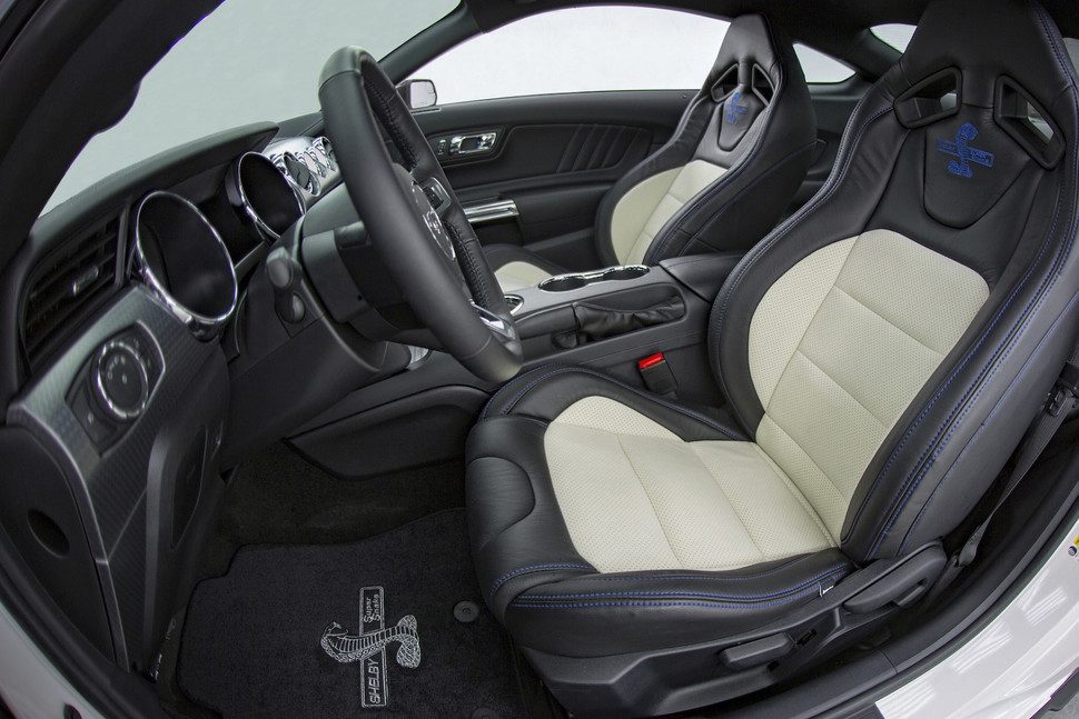 El interior está equipado con logotipos conmemorativos en los asientos y alfombrillas, placas especiales en los umbrales de las puertas, y un conjunto de instrumentos de nuevo diseño con indicadores inalámbricos Autometer. Una placa de metal grabado en el tablero con el número de serie del vehículo recuerda a los pasajeros que no están montados en un Mustang cualquiera.