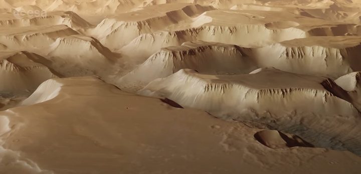 «Presenta una vista en perspectiva hacia abajo y a través de este fascinante paisaje, mostrando ‘graben’ distintivos, partes de la corteza que se han hundido en relación con su entorno», explicó la ESA en las notas que acompañan al video. Los cañones y valles que puedes ver tienen hasta 18 kilómetros (6,30 millas) de ancho y 3 kilómetros (7,6 millas) de profundidad.