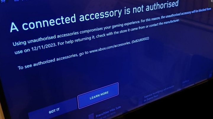 Los jugadores informan de un mensaje de advertencia que se muestra en Xbox cuando conectan accesorios no autorizados, notificándoles la fecha en que se bloquearán sus accesorios con «error 0x82d60002».