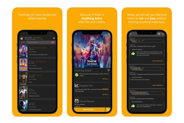 RunPee es una aplicación muy útil para quienes aman ver las películas en el cine. Se trata de una aplicación que te indica el mejor momento para ir al baño durante una película y te resume lo que ha pasado mientras estabas fuera. Es decir, te avisa cuándo ocurren esas escenas que no son tan fundamentales para el filme que estás viendo.