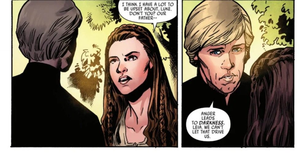 Después, en una página posterior, podemos observar como Luke le ruega a su hermana que entienda, que sepa la empatía que llegó a sentir por su padre, y le ofrece a Leia la oportunidad de alejar la ira que sintió en ella la noche anterior, pero Leia no quiere.