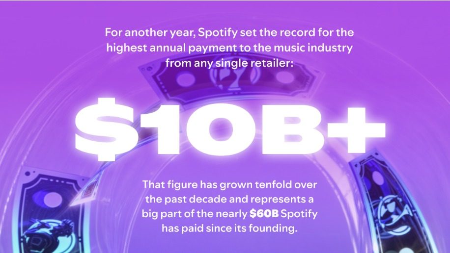 El streaming musical dice que pasó de pagar en 2014 la cifra de $ 1 mil millones de dólares, con alrededor de 15 millones de suscriptores de pago, a 2024, cuando pagó una cifra récord de 10.000 millones de dólares a la industria musical, lo que supone un total de casi 60.000 millones de dólares «desde nuestra fundación».
