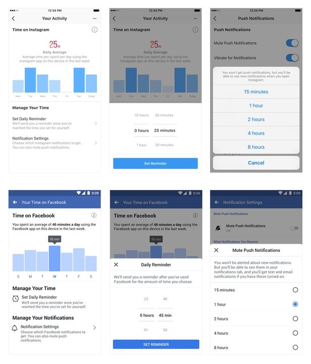 Lo que debes hacer en Facebook es dirigirte a la sección de configuración y luego seleccionar Your Time on Facebook. En Instagram, deberás ir a Configuración y luego elegir la opción Your Activity donde podrás decirle a la aplicación cuánto tiempo quieres pasar en ella. Puedes seleccionar entre 15 minutos y 8 horas diarias. Si excedes el límite que te pusiste, la app te enviará una alerta, indicándote que ya cumpliste con tu límite.