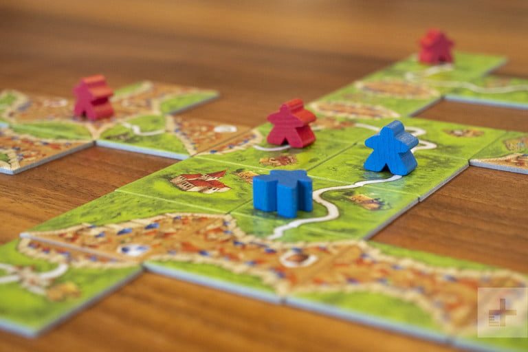 Las reglas son claras: cuando sea tu turno, sacas una pieza al azar y la colocas junto a las que ya están en la mesa formando el creciente panorama. Conecta caminos con caminos, campos con campos, ciudades con ciudades, y luego pon a tus trabajadores a que reclamen esas cosas como tuyas.