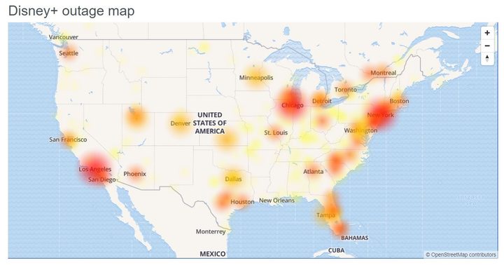 Según el sitio DownDetector, a partir de las 6 a.m. PT, había más de 8,400 informes de problemas con Disney Plus. Los problemas más reportados tienen que ver con la transmisión de video. Basado en el mapa de interrupción en vivo, los errores técnicos están afectando principalmente a los suscriptores en Estados Unidos.