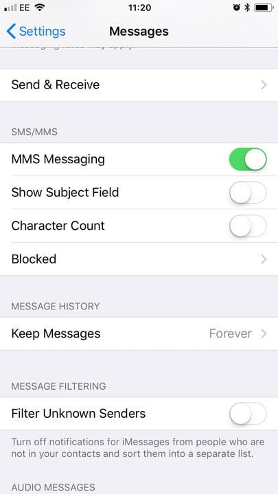 Desafortunadamente, no puedes bloquear los mensajes de números desconocidos y privados de la misma manera. Sin embargo, puedes filtrarlos y separarlos del resto de la gente que sí conoces y aceptas. Para ello, dirígete a Configuración> Mensajes y accede a la opción Filtrar remitentes desconocidos. Esto creará una nueva pestaña en tu aplicación de Mensajes llamada Remitentes desconocidos, de manera que no obtendrás notificaciones de estos. Puede que no sea ideal, pero sirve.