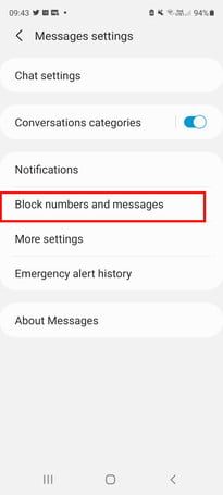 También puedes dirigirte a Mensajes> Más> Ajustes. Puntea en Bloquear mensajes para seleccionar la casilla de verificación y, a continuación, Bloquear lista. Desde aquí, ingresa manualmente el número del contacto y selecciona el signo + o elige dentro de tu bandeja de entrada o lista de contactos a la persona o contacto que quieres bloquear. Cuando hayas ingresado todos los números que quieras bloquear, toca la flecha hacia atrás.