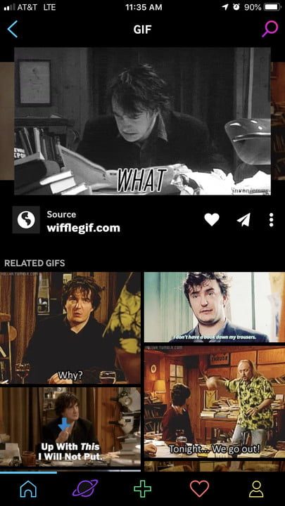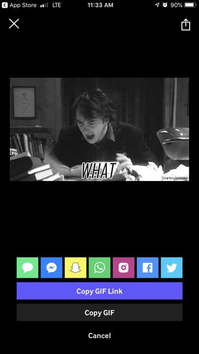 Giphy es un motor de búsqueda popular para los archivos GIF. Lo bueno de Giphy, además de su robusta biblioteca, es que la aplicación móvil te permite publicar rápidamente en varias redes sociales y automatiza el proceso de conversión de video para Instagram.