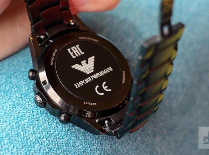 Existen cinco modelos, cada uno hecho de materiales ligeramente diferentes, y con variados diseños de correa. Nuestro modelo de revisión es (en nuestra opinión) el que tiene mejor aspecto. Está hecho de acero inoxidable negro y la correa tiene una mezcla de eslabones de finalización pulida y mate, y si miras de cerca la corona, verás el logo de Emporio Armani. En el borde encontrarás dos botones secundarios para controlar el sistema operativo Android Wear. Las correas tienen accesorios de liberación rápida, por lo que se pueden intercambiar en un instante.