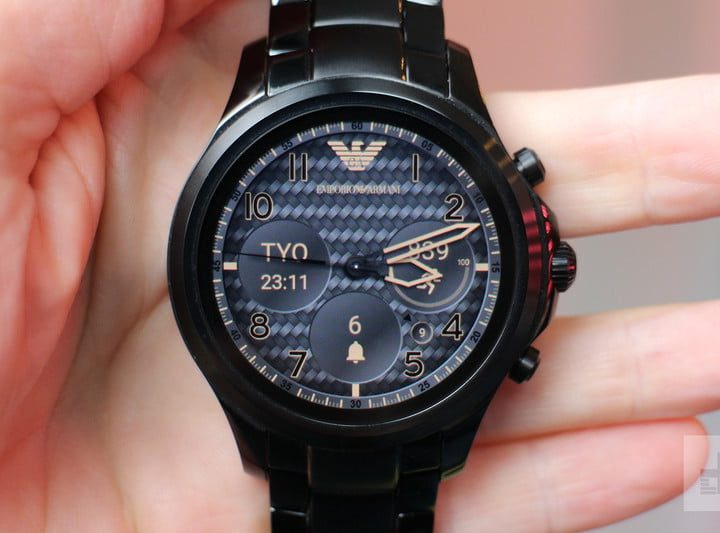 Una de las mejores funciones de un reloj inteligente es que puedes cambiar la esfera del reloj en cualquier momento. Armani ha incluido varias caras de reloj, que son altamente personalizables. Todo, desde el color de las manillas, el fondo y los dígitos, se puede cambiar para adaptarse a tus gustos. Es fácil de hacer, por lo que es realista cambiar el estilo para que coincida con lo que llevas puesto a diario. Además, existen otros cientos de caras de reloj de otros creadores disponibles a través de Google Play; aquí es donde Android Wear supera a Apple Watch, pues no estás restringido a unos pocos diseños de la compañía.