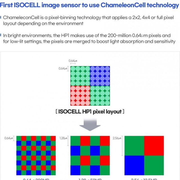 En condiciones de poca luz, el sensor combinará pixeles en un modo de agrupación de 4 por 4 para lograr imágenes de 12.5 MP con un tamaño de pixeles de 2,56 μm. En el caso de que la iluminación del entorno sea favorable, el sensor puede agrupar los pixeles de dos en dos para tener imágenes de 50 MP o incluso lanzar imágenes de manera nativa de 200 MP y pixeles de 0.64 μm. En cuanto a la grabación de video, Samsung dice que el HP1 es capaz de filmar en 8K a 30 FPS.