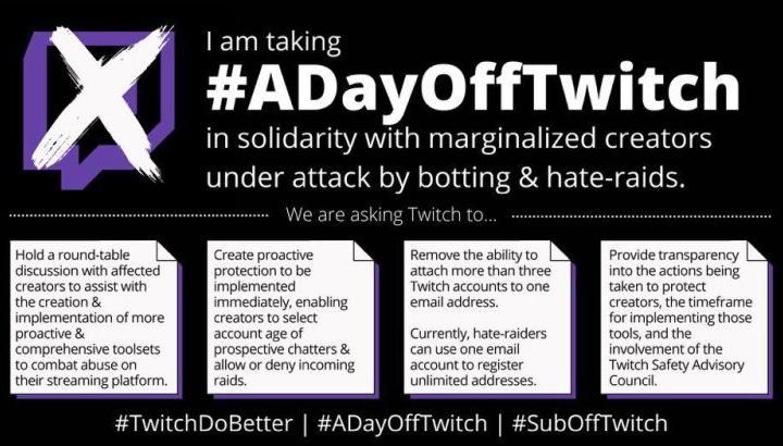 En los últimos meses, muchos de los streamers de Twitch han recibido algún tipo de acoso en los chats de sus transmisiones, sobre todo raids de odio. Estos son ataques de usuarios anónimos, quienes usan bots para acosar a los creadores con mensajes ofensivos en su chat. Por esa razón, los streamers hicieron un llamando a la comunidad para boicotear la plataforma el 1 de septiembre en una protesta llamada #ADayOffTwitch.
