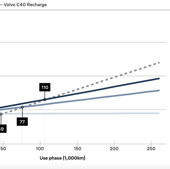 En el escenario del uso de electricidad de origen 100 por ciento renovable, la C40 Recharge compensa las emisiones creadas en su fabricación después de recorrer 49,000 km (30,625 millas), ese umbral aumenta a 77,000 km (48,125 mi) con la mezcla europea y a 110,000 km (68,750 mi) con la mezcla mundial. El estudio nunca menciona el umbral de los 200,000 km (125,000 mi), excepto como el estimado de vida útil del vehículo, el que hay que decir que en ese momento tendrá una huella de carbono negativa, ya que habrá compensado más CO2 del que contribuyó durante su uso y operación.