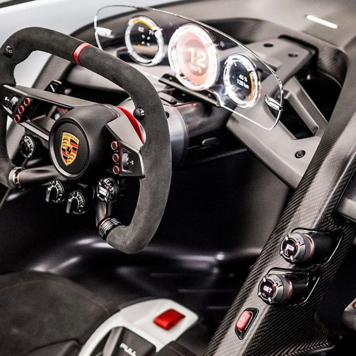 Porsche dice que su diseño se enfocó en las necesidades del piloto, por lo que todos sus controles se encuentran en el timón. Un toque hiperfuturista es su cuadro de instrumentos proyectado en una pantalla de holograma curva que parece flotar sobre el volante.