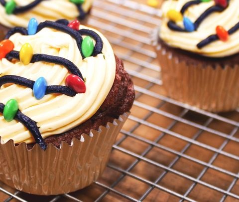 Para decorar, coloca el glaseado de queso crema sobre los cupcakes. Dibuja líneas onduladas alrededor de la magdalena para que parezca un cable y coloca los M&M a lo largo del glaseado para imitar luces navideñas.