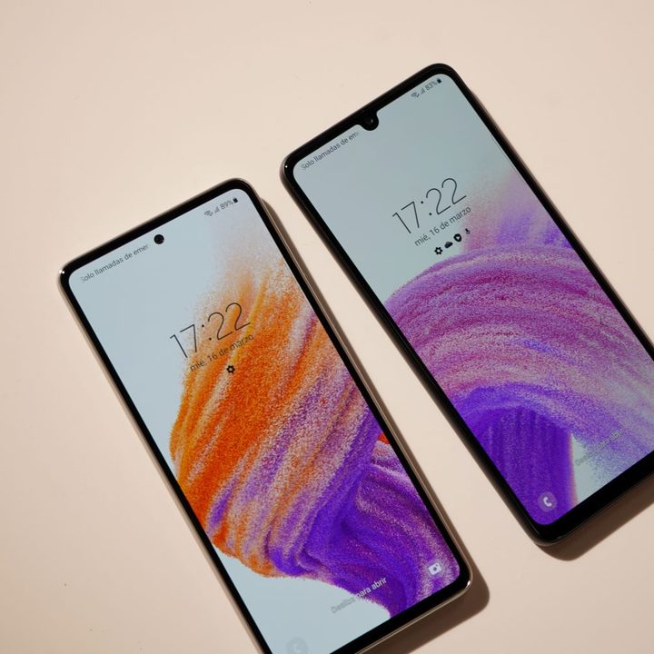 Por fuera, y sobre todo por detrás, ambos teléfonos son prácticamente idénticos. Sus dimensiones son similares, aunque el A53 tiene una pantalla Super AMOLED de 6.5 pulgadas FHD+ con tasa de actualización de 120 Hz y con una agujero para albergar la cámara frontal.