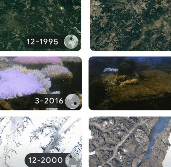 La secuencia mostrará el glaciar en la cima del Monte Kilimanjaro de Tanzania derritiéndose entre diciembre de 1986 y 2020; retroceso glacial en Sermersooq, Groenlandia, de diciembre de 2000 a 2020; impactante blanqueamiento de corales alrededor de la Isla Lagarto de la Gran Barrera de Coral desde marzo de 2016 hasta octubre de 2017; y la destrucción de los bosques de Harz en Elend, Alemania, entre diciembre de 1995 y 2020.