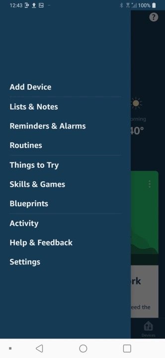 Puedes tocar el ícono del menú de tres líneas y seleccionar Configuración para revisar sus diversos dispositivos habilitados para Alexa y establecer nombres para ellos, así como ubicaciones, zonas horarias y preferencias para las unidades de medición de temperatura y distancia.