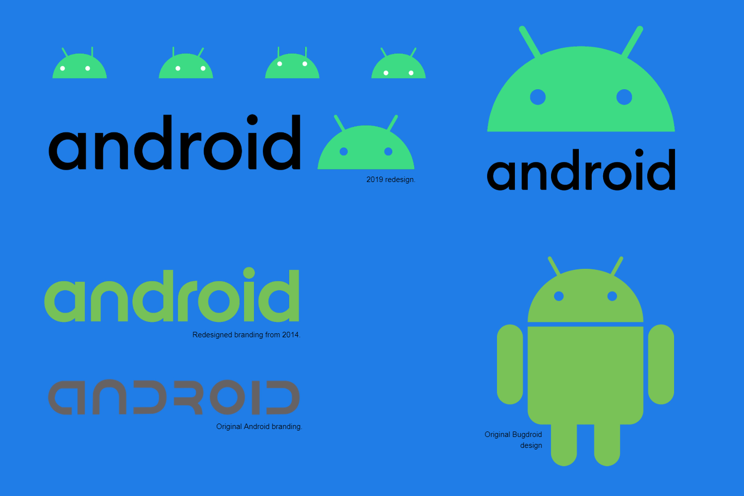 Google ya había dado un cambio de imagen a la marca original de Android en 2014. Cinco años más tarde, llegó la hora de cambiar las cosas nuevamente. El estilo en sí se ha reducido un poco en comparación de la variante previa y ahora las letras son negras en lugar de verdes. Además, su icónico robot (que por si no lo sabías se llama Bugdroid), también se ha incorporado al logotipo, asomando la cabeza con sus típicas antenitas.