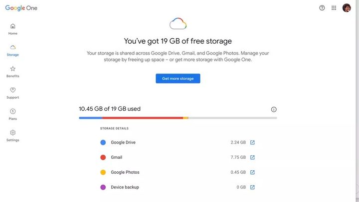 A través de este sitio puedes ver de forma clara y sencilla cuánto espacio has usado. En este apartado, el almacenamiento aparece dividido en Google Drive, Gmail, Google Fotos y la copia de seguridad de tu dispositivo.