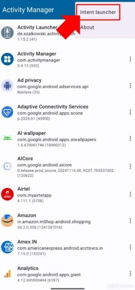 - Inicie la aplicación y seleccione Intent Launcher en el menú desplegable en la esquina superior derecha.