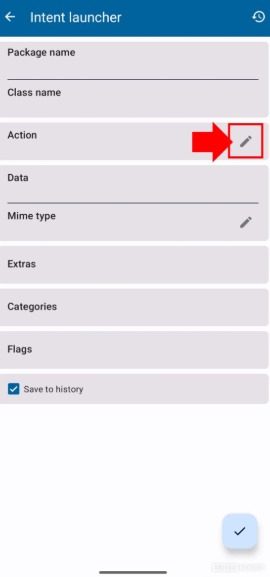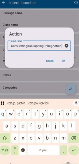 - Toca el icono de edición junto al campo Acción y escribe o pega esto: com.google.android.gms.cast.settings.CastSettingsCollapsingDebugAction