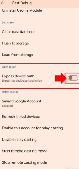 - Esta solución fuerza la apertura de la página de configuración de depuración de transmisión y le permite habilitar la opción Omitir autenticación de dispositivo (es decir, le permite desactivar la autenticación del dispositivo), lo que soluciona parcialmente el problema. Ahora debería poder transmitir desde aplicaciones, y la aplicación Google Home también debería funcionar parcialmente.
