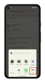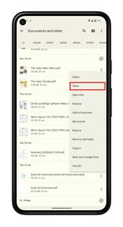 Paso 2: Selecciona los tres puntos al lado del archivo y luego dale al botón Compartir. Alternativamente, es posible que debas Enviar una copia en algunas aplicaciones, como en Google Docs.