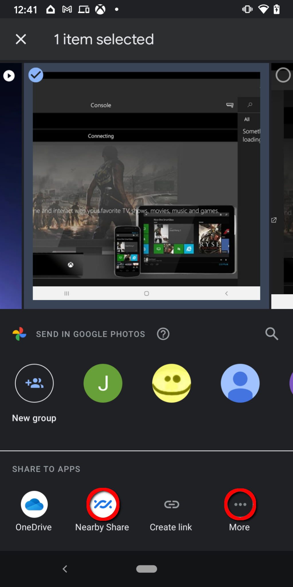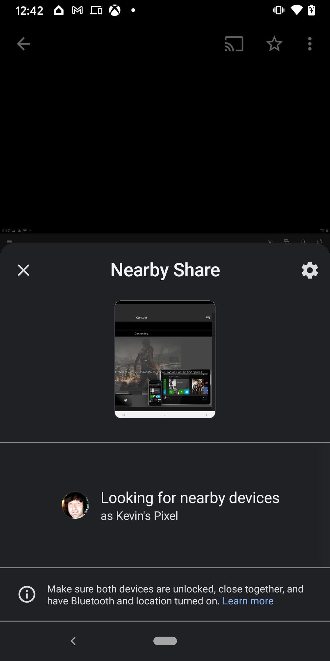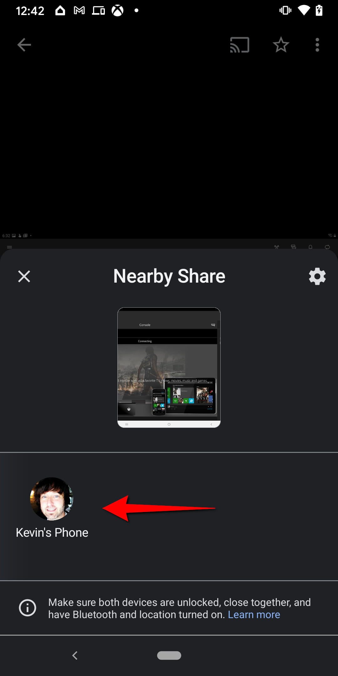 Paso 4: en la pantalla, el panel Nearby Share se despliega con una miniatura del archivo que estás enviando. La sección Buscando dispositivos cercanos debería cambiar y mostrar los dispositivos que estén cerca para recibir el archivo. Luego, selecciona al dispositivo receptor.