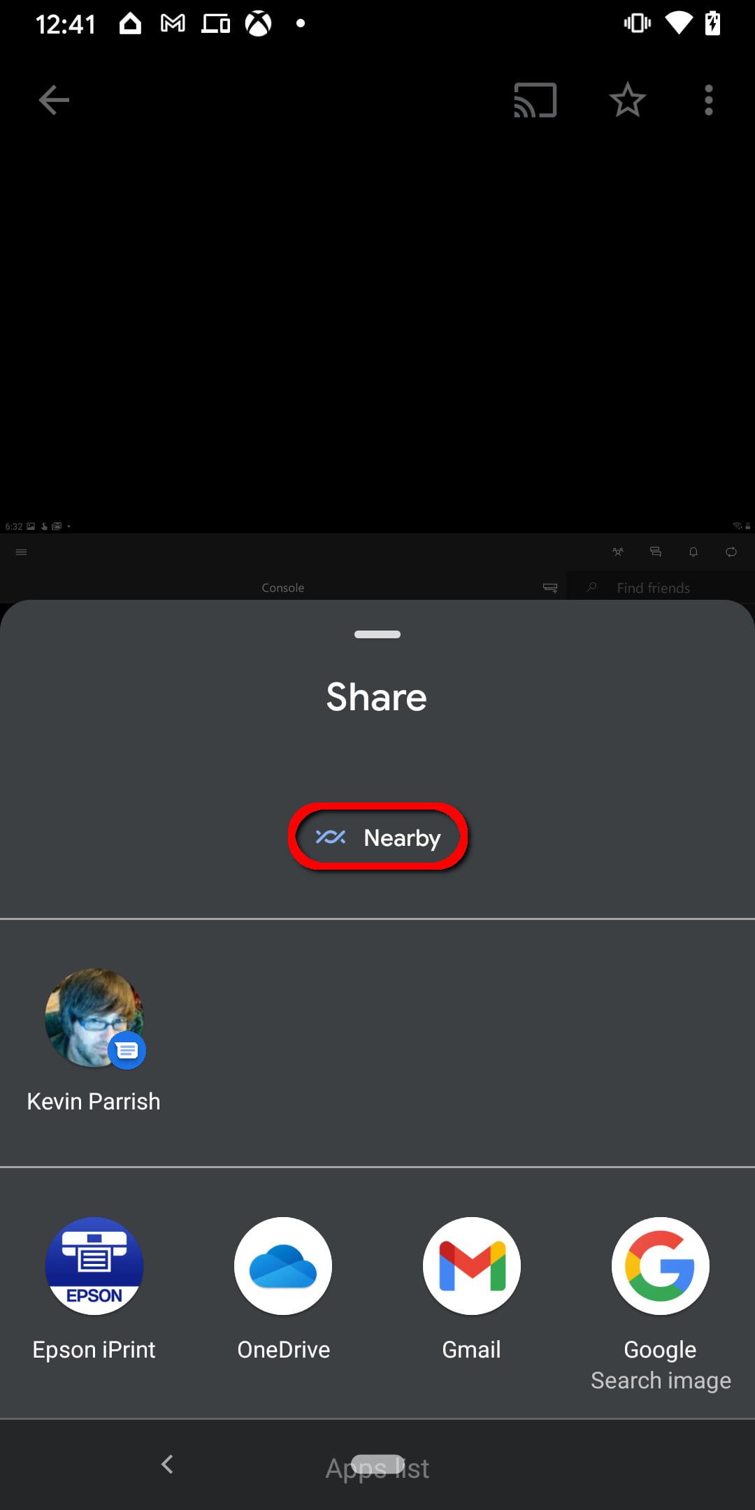 Paso 3: toca Nearby Share. Si no ves esta opción, toca el botón Más que se muestra en la Lista de aplicaciones y luego toca Nearby en la siguiente pantalla, como se muestra arriba.