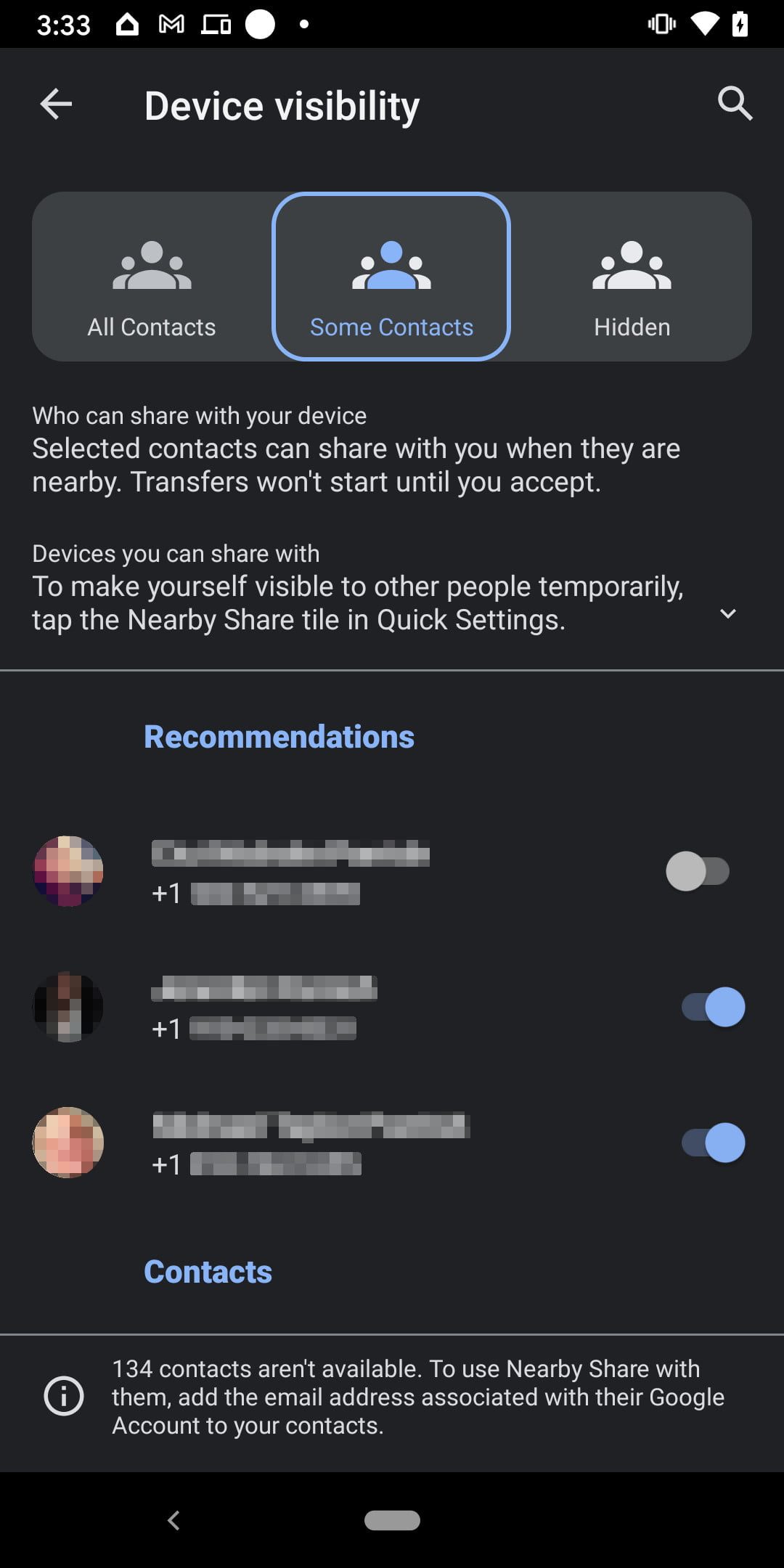 Paso 3: toca Visibilidad del dispositivo para alternar entre tres modos: Todos los contactos, Algunos contactos u Oculto. Si seleccionas Algunos contactos, verás un interruptor oscurecido junto a cada contacto. Toca el interruptor correspondiente a los contactos que quieras para permitir la conectividad con Nearby Share.