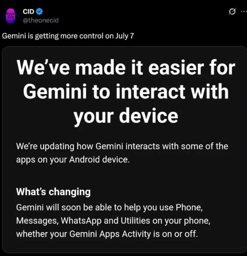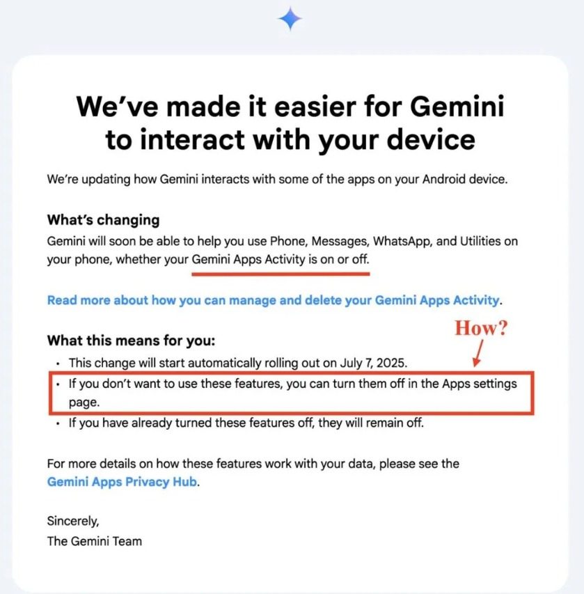 El correo electrónico informa: «a partir del 7 de julio de 2025, Gemini podrá «ayudarlo a usar el teléfono, Mensajes, WhatsApp y utilidades en su teléfono, ya sea que su actividad de Gemini Apps esté activada o desactivada».