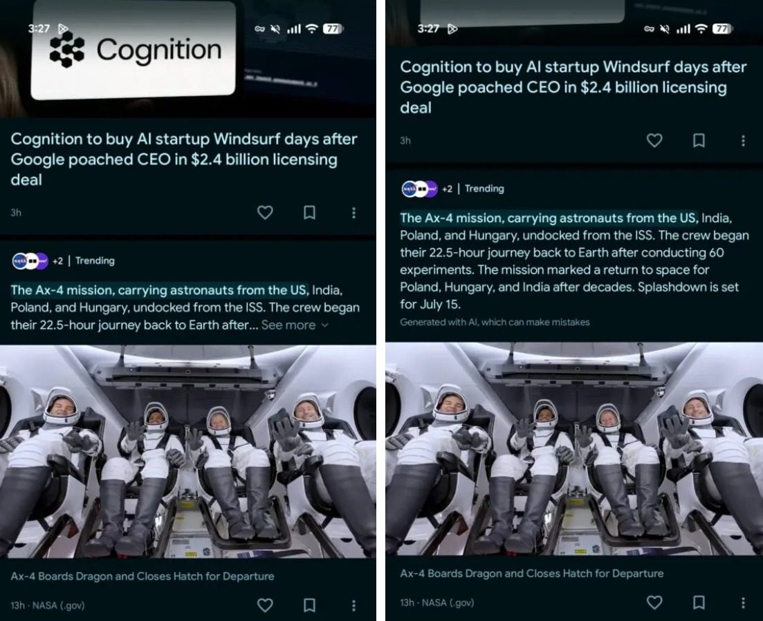 Según las capturas de pantalla que vemos, solo las primeras tres líneas de los resúmenes son visibles inicialmente, y el resto se puede revelar tocando el botón «Ver más». No todos los artículos de la sección Discover van acompañados de resúmenes de IA, sino solo los etiquetados como «Tendencias».