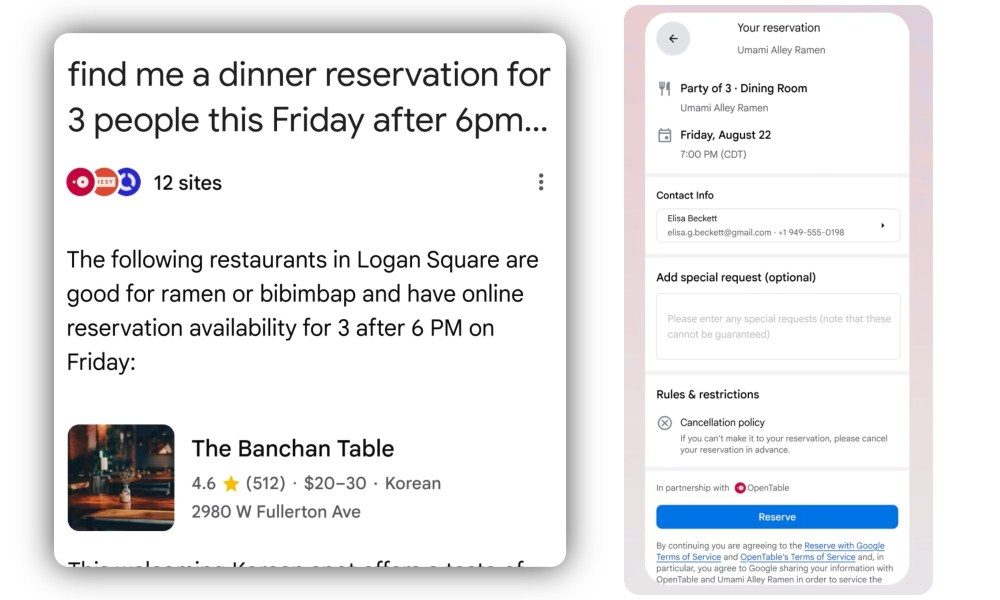 Ahora, el modo AI de Google no solo le dará respuestas, sino que también realizará acciones de varios pasos, lo que le ahorrará una visita a diferentes sitios web y muchos clics y toques. Digamos que desea reservar una mesa en un restaurante. Simplemente escriba sus requisitos, el modo AI entrará en acción y lo llevará directamente a la página de reserva después de completar todos los detalles.