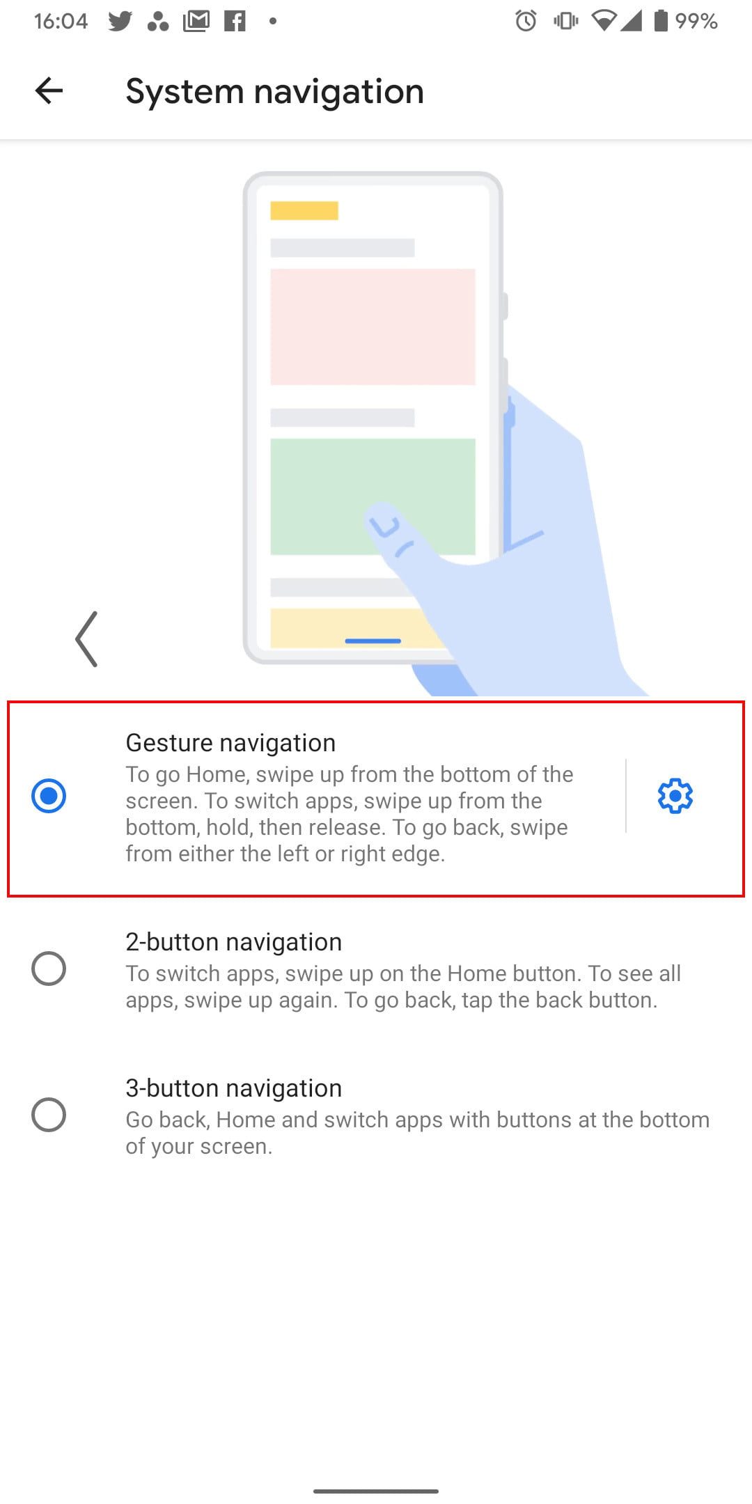 - La navegación de 2 botones es la navegación por gestos introducida en Android 9.0 Pie, con el botón de inicio en forma de pestaña deslizable y un botón de retroceso separado.