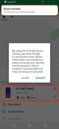 Si tu dispositivo perdido tiene acceso a internet y el rastreo de ubicación está activado, averiguará dónde está. Una de las grandes características aquí es que puedes bloquear el dispositivo y escribir un mensaje con un número de teléfono adjunto. De esa manera, si alguien encuentra o tiene su dispositivo, todo lo que tiene que hacer es presionar el botón Llamarme en la pantalla para llamar al número de teléfono especificado. También puedes optar por reproducir un sonido (muy alto) o borrar el teléfono de forma remota.