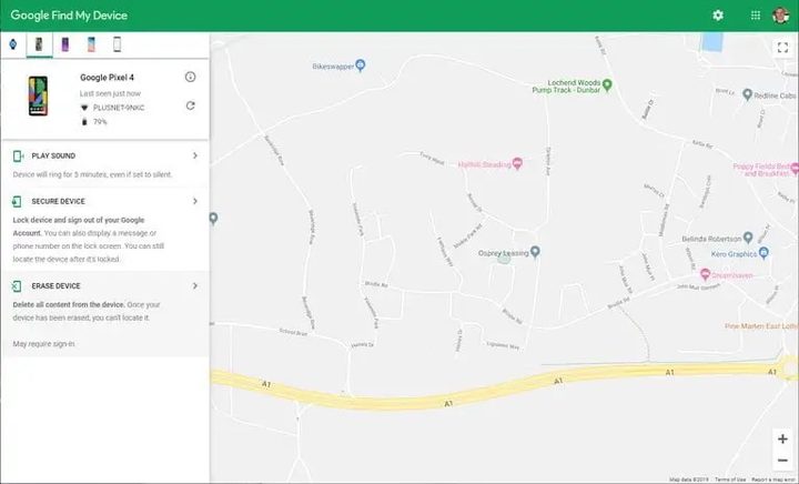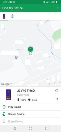 La siguiente secuencia se tomó en un LG V40 ThinQ con Android 10. Una búsqueda rastrea todos los dispositivos en los que has iniciado sesión. Las características incluyen rastrear tu teléfono, tableta o reloj inteligente a través de GPS, borrar de forma remota, reproducir un sonido o bloquear tu dispositivo.