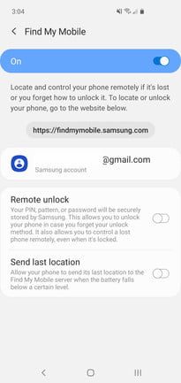 Con el desbloqueo remoto Samsung almacena tu PIN, contraseña o patrón, para que puedas desbloquearlo incluso si lo olvidas, pero también se puede usar para controlar tu teléfono de forma remota. Enviar última ubicación envía –como su nombre lo dice– la última ubicación conocida de tu teléfono a los servidores de Samsung cuando la batería está a punto de agotarse, por lo que bien vale la pena activarlo. También puedes iniciar sesión en el sitio web de Samsung con tu cuenta en cualquier navegador para rastrear tu teléfono o tableta perdida.