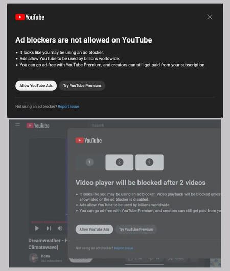Youtube no quiere más molestias y ha comenzado a tomar medidas contra los bloqueadores de anuncios: si la plataforma detecta que hay un bloqueador en uso, mostrará una advertencia al usuario; en el caso de detectar que el usuario ve dos vídeos usando bloqueadores de anuncios, bloqueará el acceso al reproductor.