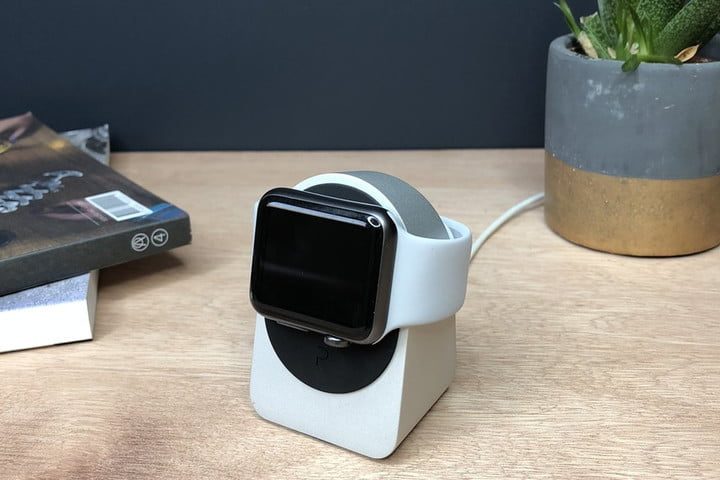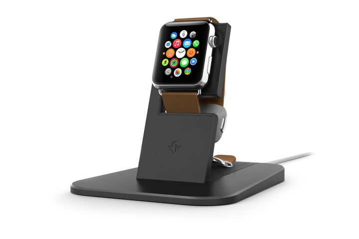 Es un soporte de metal pulido con una base ancha que tiene goma antideslizante en la parte inferior. Las almohadillas de silicona proporcionan un toque estético y amortiguan el Apple Watch. También hay una almohadilla de aterrizaje de cuero en la parte posterior para la banda y la hebilla. El cable se mantiene ordenado en una ranura alrededor de la parte posterior y se extiende debajo de la almohadilla de cuero. El soporte viene en plata o negro.