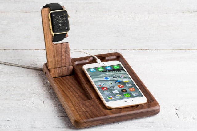 Cada uno está tallado en una sola pieza de nogal americano, cerezo o caoba africana. Es compatible con el cable de carga para el Apple Watch y un teléfono en la parte posterior. Y hay cuatro pies antideslizantes en la parte inferior.