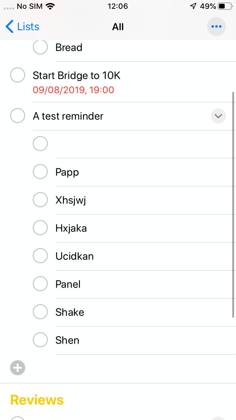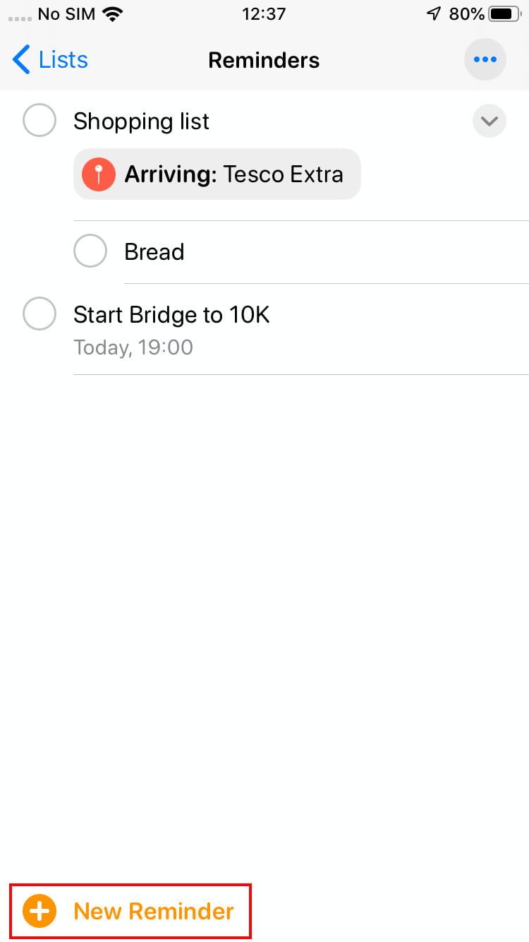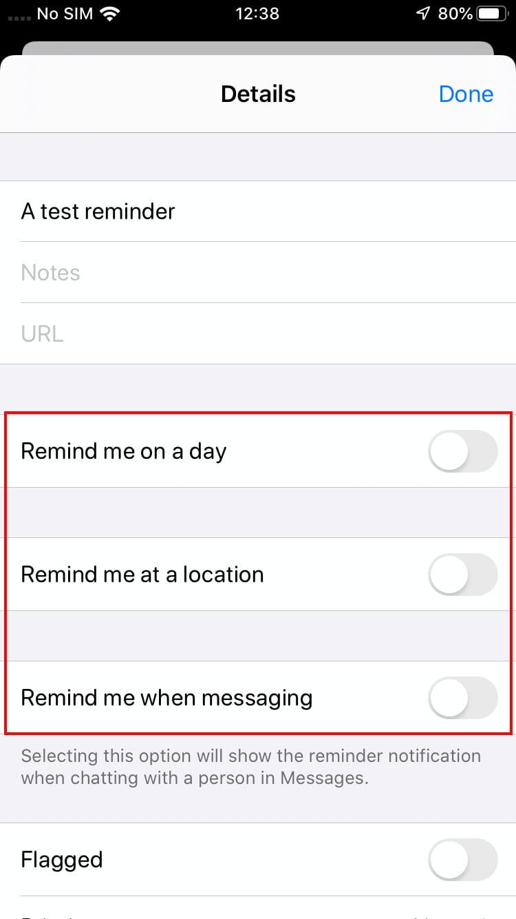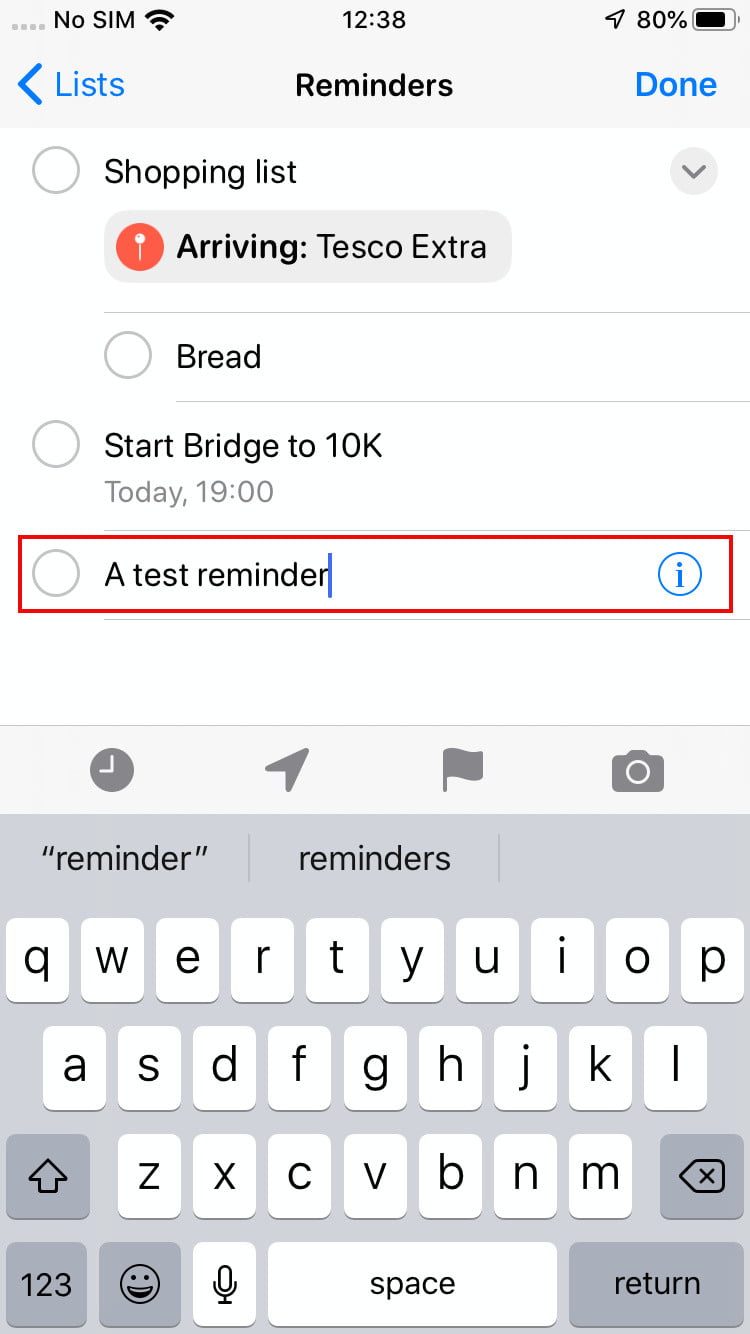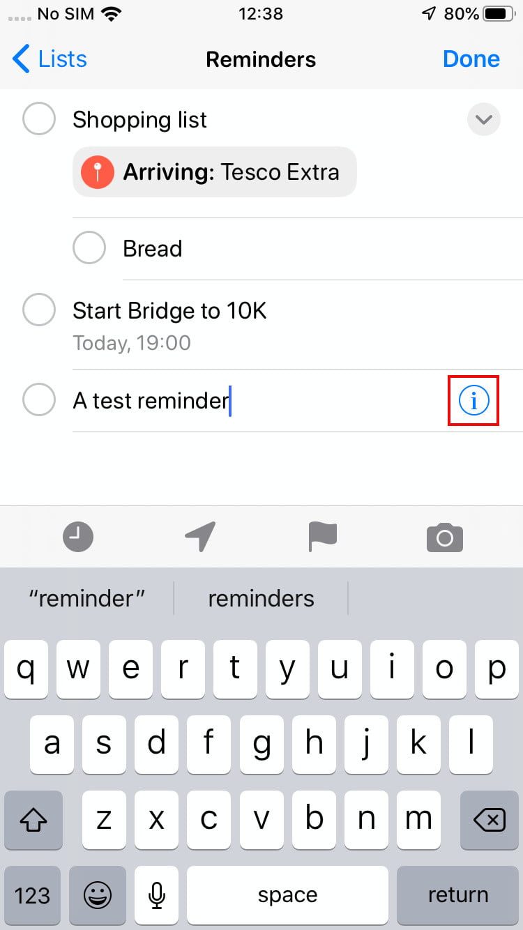 Una vez que hayas terminado, encontrarás las subtareas debajo del recordatorio principal. Podrás completarlos por separado, tocando la “i” azul y añadiendo ubicaciones, horas o contactos para cada una de las actividades.