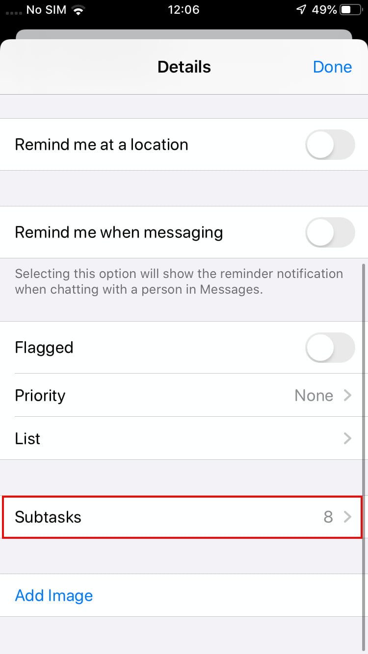 También puedes agregar subtareas a proyectos más complejos. Para ello, dirígete a la tarea y toque la “i” azul para abrirla. Luego, desplázate hacia abajo hasta que encuentres Subtareas. Selecciona esta opción y presiona Agregar recordatorio para añadir una subtarea. Puede agregar todas las que necesites.