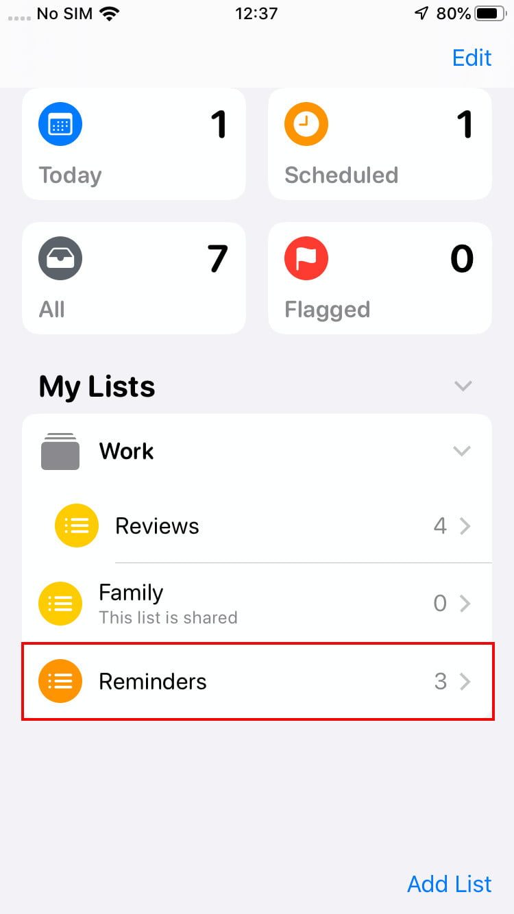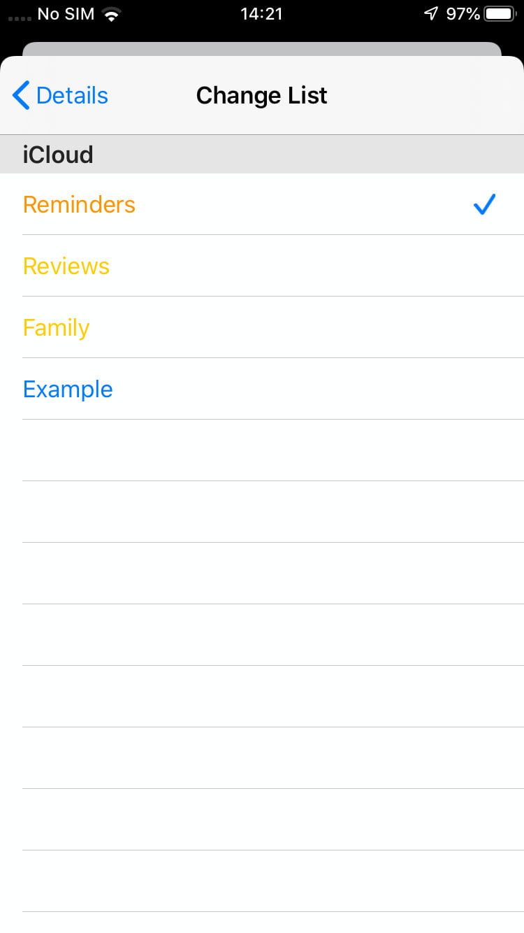 Para agregar tareas y recordatorios a una lista, selecciona Mis listas. Para agregar una actividad existente, búscala, selecciona y luego presiona la “i” azul para abrir sus opciones. Desplázate hacia abajo y toca Lista, luego seleccione dónde quieres añadirla.