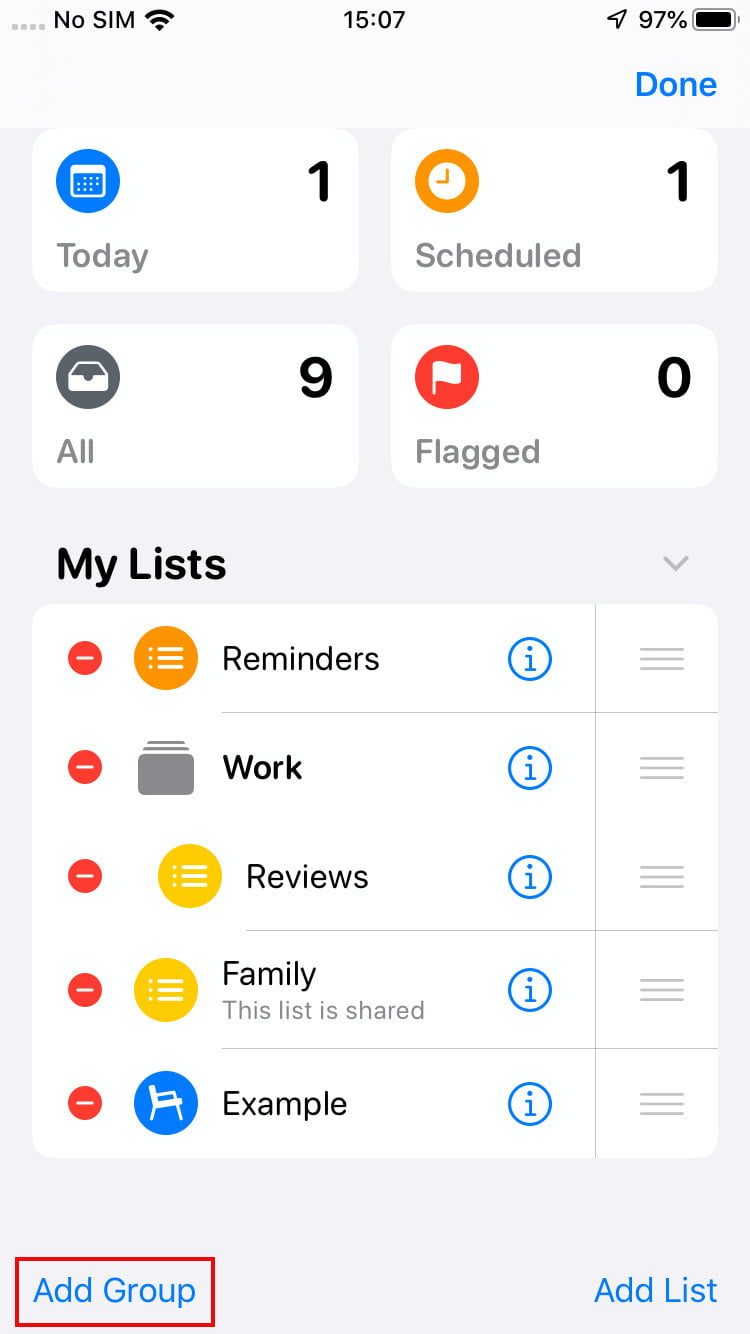 Crear un grupo es fácil. Desde la página de inicio de Recordatorios, presiona Editar en la esquina superior derecha. Luego toca Agregar grupo en la parte inferior izquierda. Asigna un nombre y selecciona las listas que deseas agrupar. Luego presiona Listo. Para cambiar qué listas están en el grupo, toca Editar, la “i” azul al lado del grupo, y luego agrega o elimina listas con la opción Incluir.