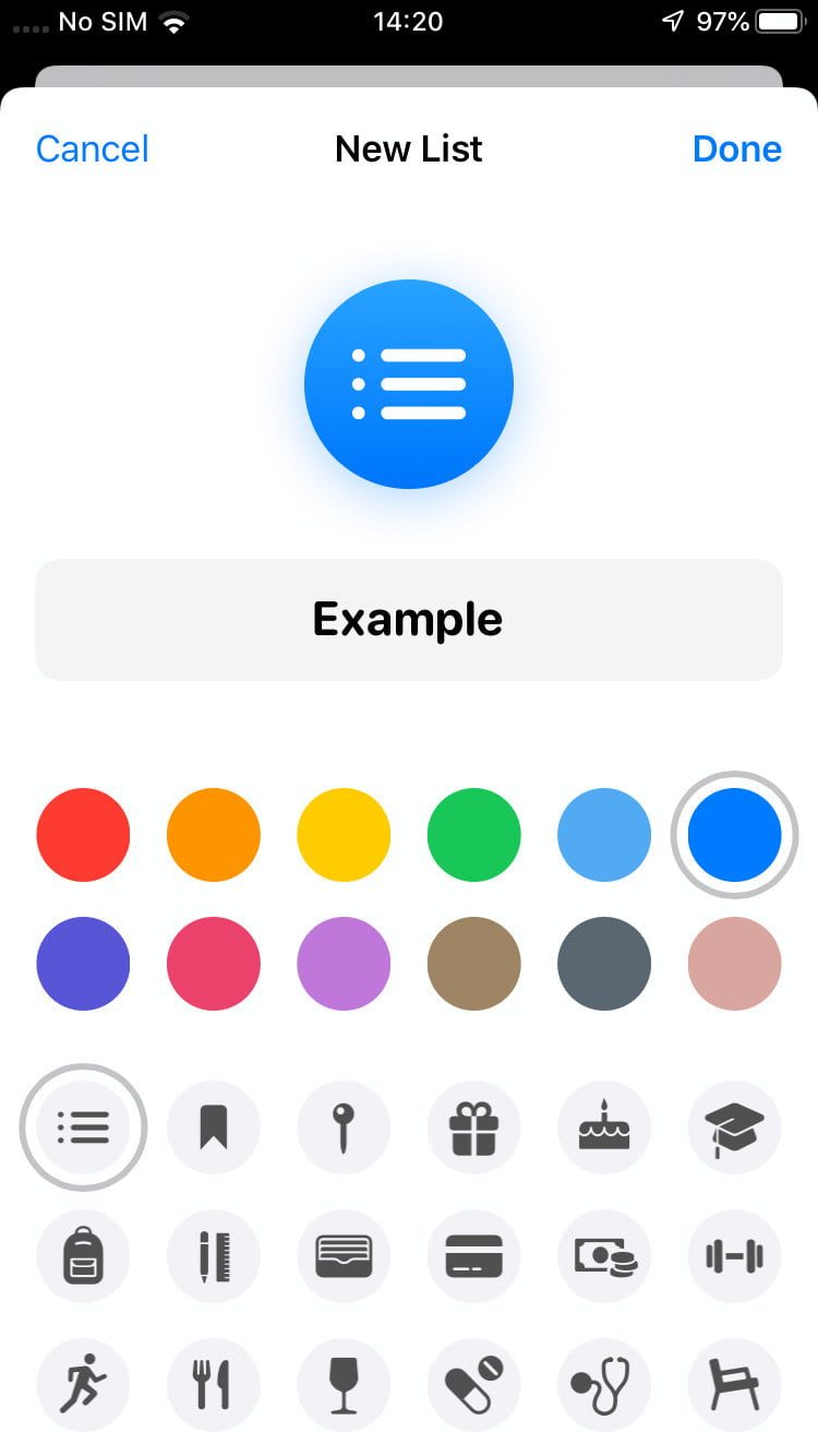Para crear una lista, abre la app Recordatorios de iOS 13 y toca Agregar lista en la parte inferior derecha. Puedes elegir entre una variedad de colores y logotipos para diferenciarlas. Cuando hayas terminado, presiona Listo en la esquina superior derecha.