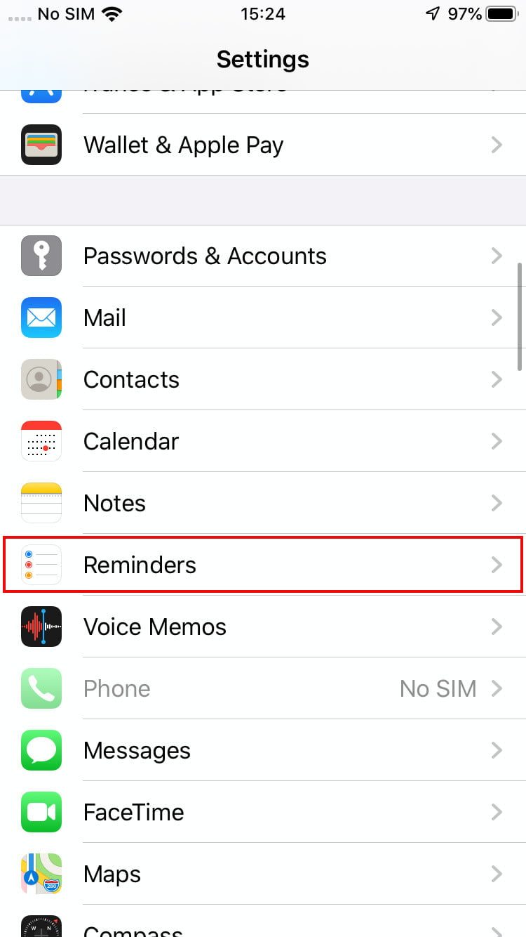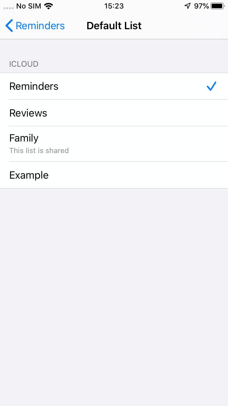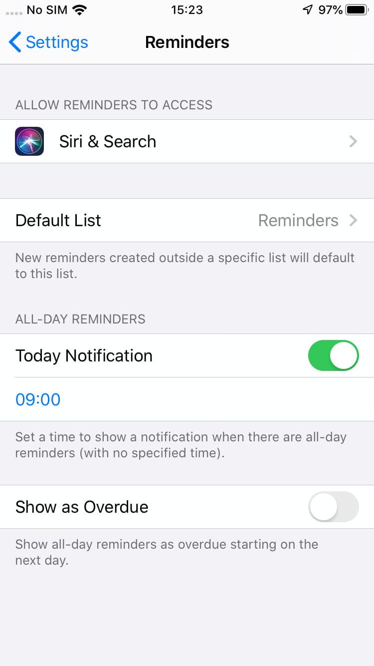 Por defecto, la app Recordatorios te dará un toque cuando tengas tareas pendientes durante el día. Sin embargo, puedes establecer si quieres que lo haga y cuándo. Para modificarlo, dirígete a la aplicación de Configuración y presiona Recordatorios. Desde allí, puedes cambiar la hora de la Notificación de Hoy o simplemente desactivarla. Ene esta sección también puedes cambiar la Lista predeterminada de tareas.