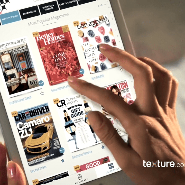 Actualmente, Texture trae a las manos de sus suscriptores más de 200 de las mejores revistas del mundo, proporcionándoles una manera fácil para leer historias, noticias, o artículos individuales, o publicaciones completas de sus ejemplares favoritos en formato digital.