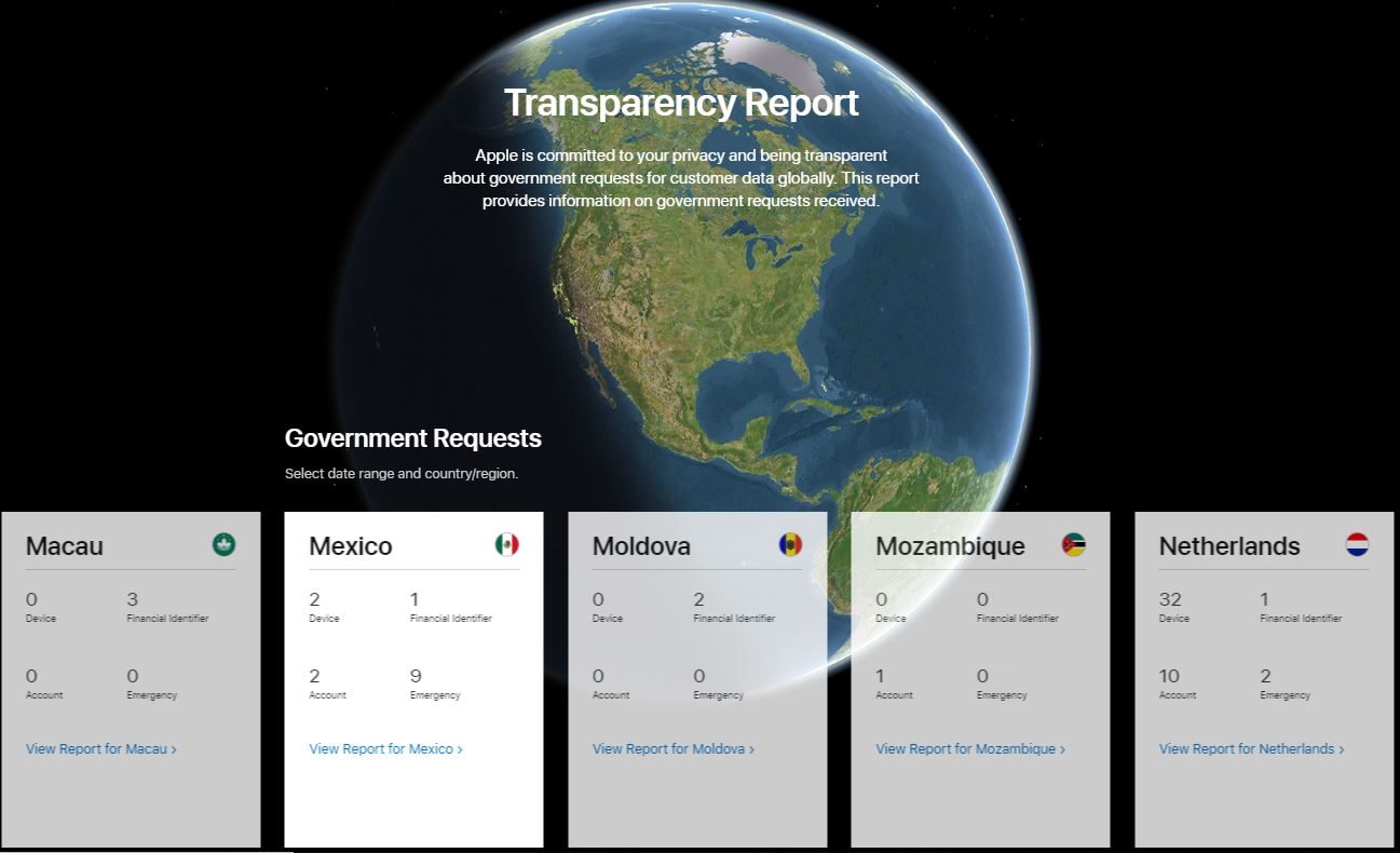 Pero ahora, Apple está llevando las cosas incluso un paso más adelante. El último Reporte de Transparencia de la compañía ahora también tiene su propia área interactiva dentro del sitio web de Apple. En el nuevo sitio podras encontrar cifras específicas de diferentes países, y también proporciona tendencias, patrones y contexto a lo largo de los ciclos de los informes de diversos años.